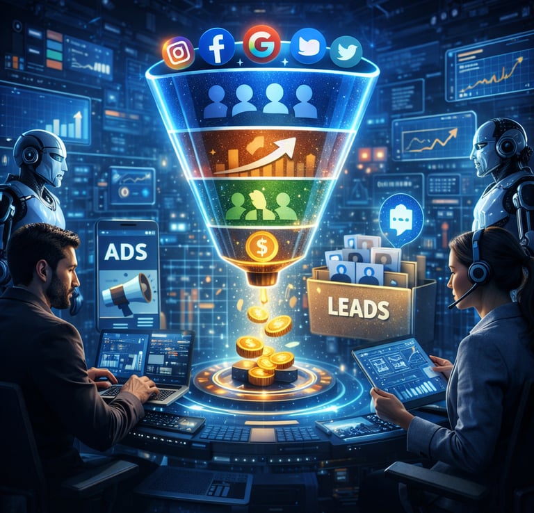 Diseñamos sistemas completos para atraer clientes de forma constante y predecible. Desde campañas publicitarias hasta embudos de conversión y estrategias de crecimiento, todo orientado a escalar tu negocio sin depender del boca a boca ni de la suerte.